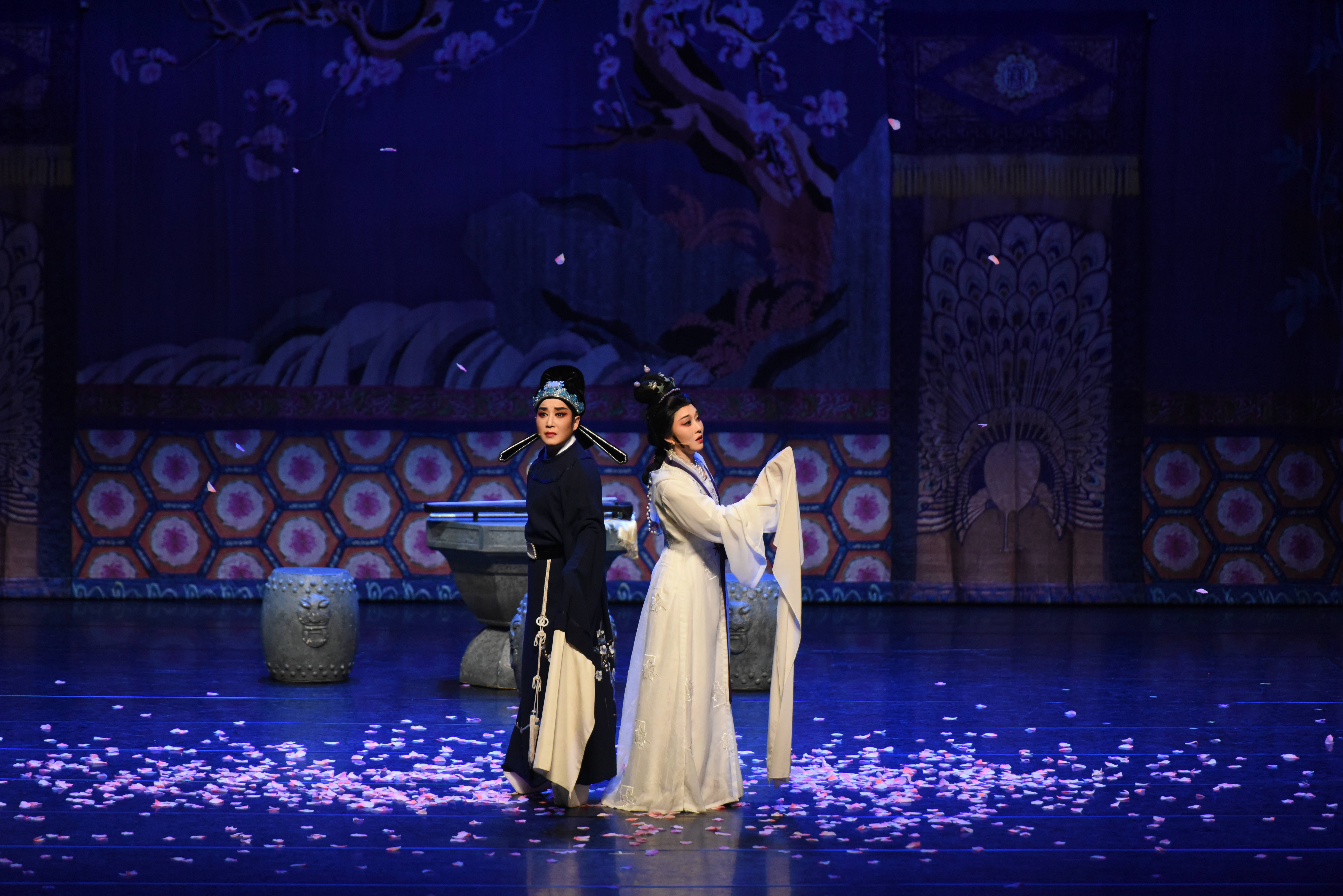 浙江小百花越剧院折子戏专场《爱情的花园》在台北市政府亲子剧场演出(2月28日摄)。新华社记者 黄扬 摄记者现场采访发现,前来看戏的观众不仅来自花莲、高雄、彰化等台湾各地,更有海外华人拖着行李箱专程前来观演。